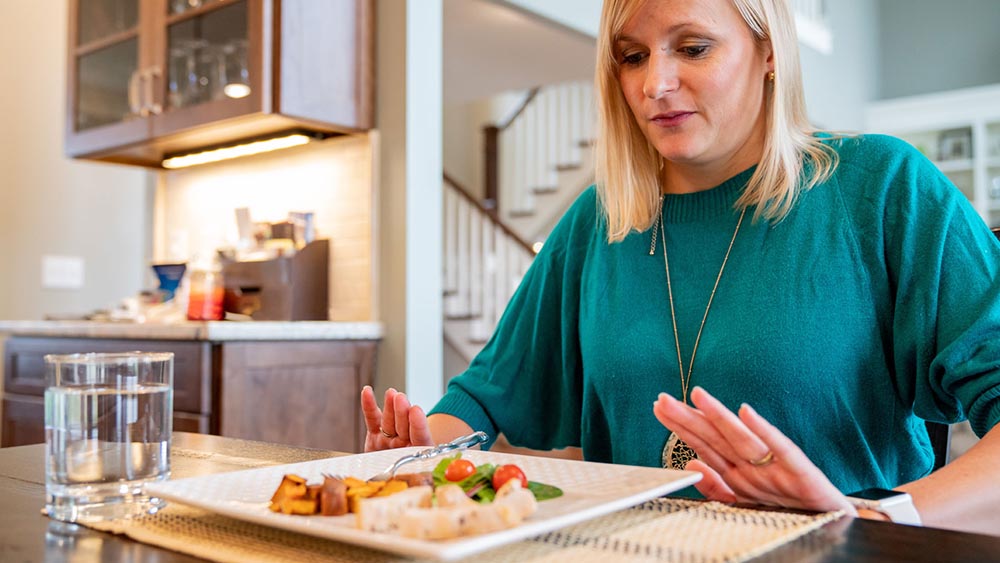 但要注意食物的质地。液体和容易消化的东西是个好主意。例如,选择苹果酱而不是整个苹果,还也可以尝试喝汤或将食物制成泥。